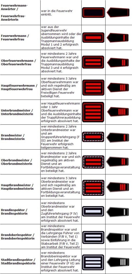 Dienstgrade richten sich in der Regel nach dem jeweiligen Ausbildungsstand und dem entsprechenden Dienstalter. Sie können unmittelbar an Funktionen gebunden werden. Manche Bundesländer (z. B. Nordrhein-Westfalen) unterscheiden allerdings streng zwischen Dienstgraden und Funktionen. Hier wird neben dem Dienstgradabzeichen ggf. ein spezielles Funktionsabzeichen getragen.
