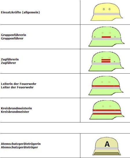 Bei den deutschen Feuerwehren finden Helmkennzeichnungen in erster Linie Verwendung, um Qualifikationen eines Feuerwehrangehörigen im Einsatz schnell erkennbar zu machen. Die tatsächlich Funktionskennzeichnung, also die Tatsache ob ein qualifiziertes Feuerwehrmitglied diese Funktion auch gerade ausübt, wird mit Funktionswesten angezeigt.
